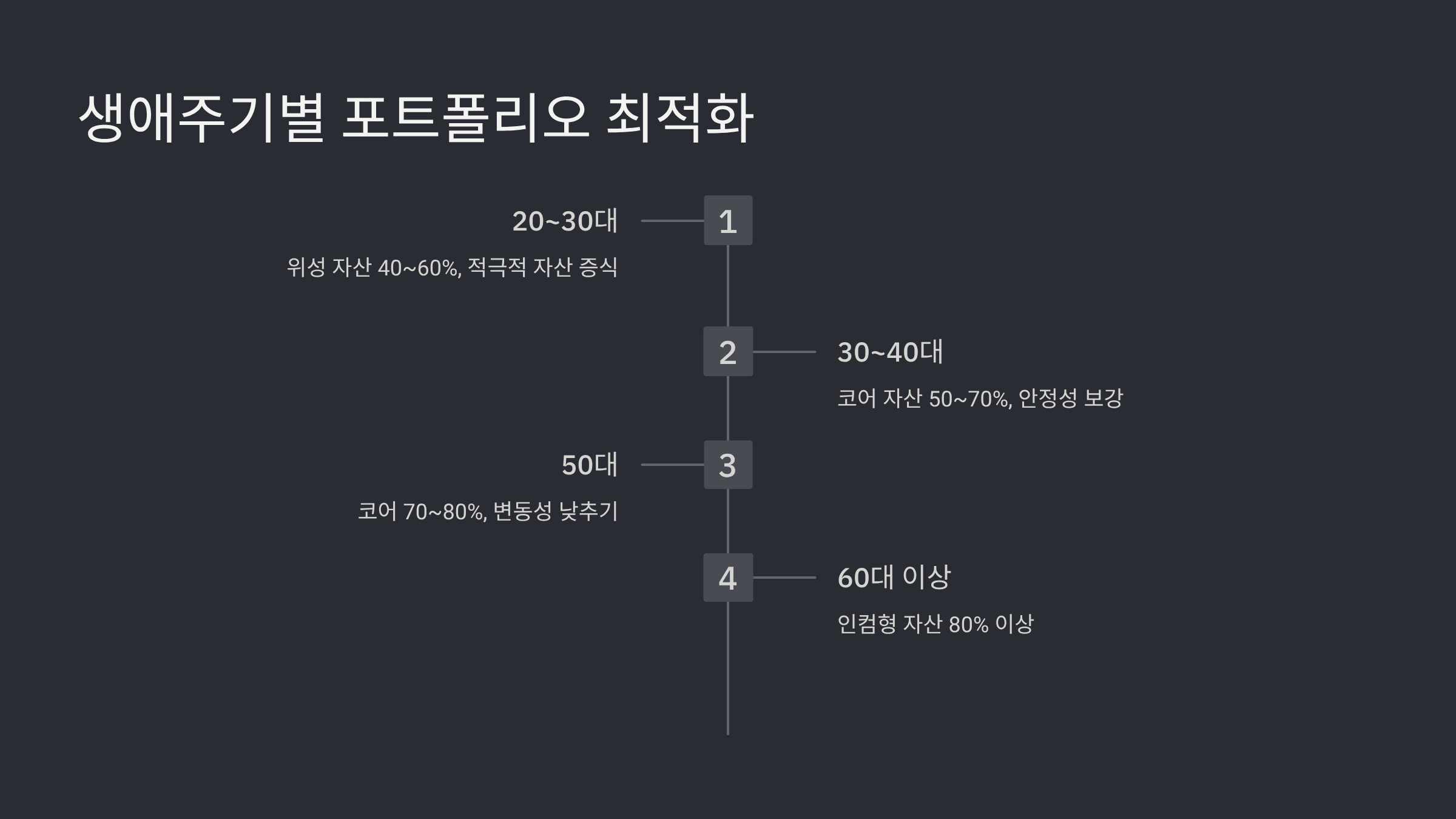 훌륭하게 구축된 포트폴리오도 한 번 만들고 끝나는 것이 아니라, 투자자의 나이, 소득, 재무 목표 변화에 따라 계속해서 진화해야 합니다. 생애주기에 맞춰 코어와 위성의 비중을 조절하고, 정기적인 리밸런싱을 통해 최적의 상태를 유지해야 합니다.