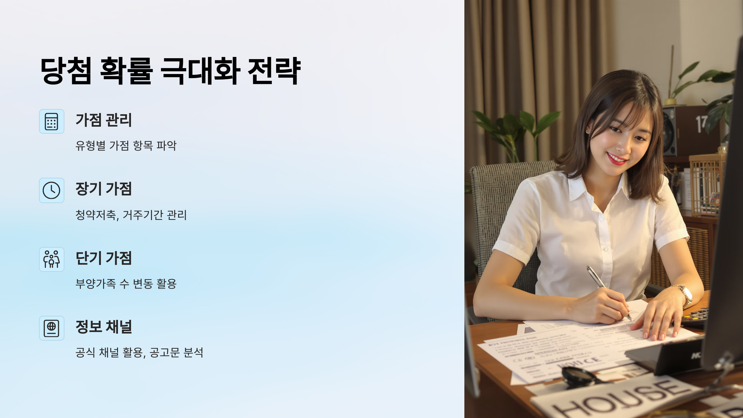 - 가점 항목 철저 분석 및 관리: 각 임대주택 유형별 가점 항목(청약저축 납입 횟수, 해당 지역 거주 기간, 미성년 자녀 수, 장애 여부, 부모-자녀 세대 등)을 정확히 파악하고, 배점이 높은 항목부터 충족시키기 위한 장기적인 계획을 세우는 것이 중요합니다. 예를 들어, 청약저축은 최소 6개월 이상, 24회 이상 등 납입 횟수가 많을수록 유리한 경우가 많습니다.